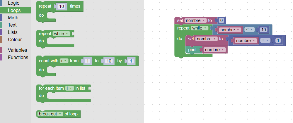 Dans l'exemple ci-dessous, nous avons une boucle qui va ajouter 1 à "nombre" et l'afficher à l'utilisateur tant que celui-ci est plus petit que 10. Exemple |
