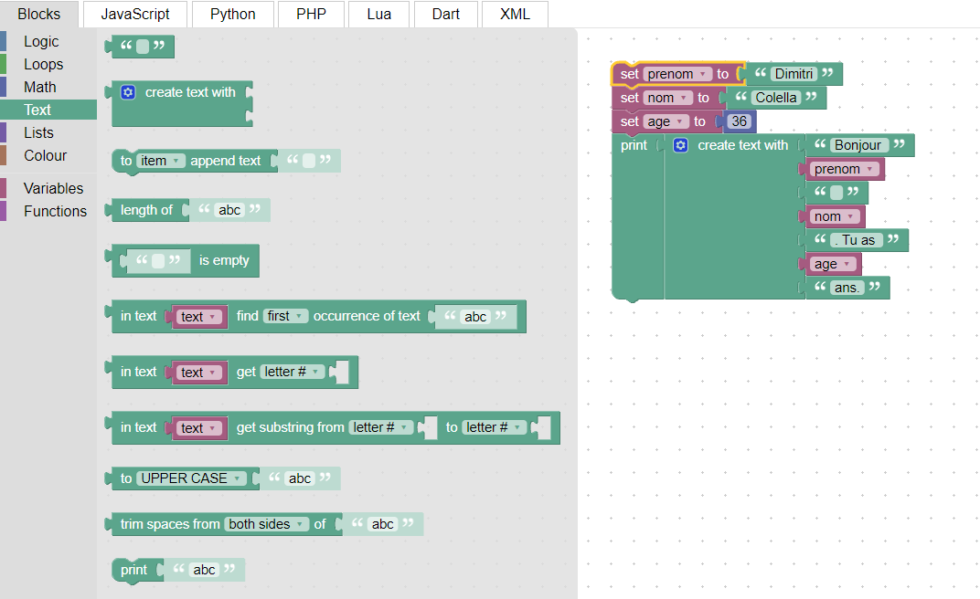Dans cet exemple nous avons 3 variables et nous les affichons avec un block qui va ajouter le text sur la même ligne. Exemple |