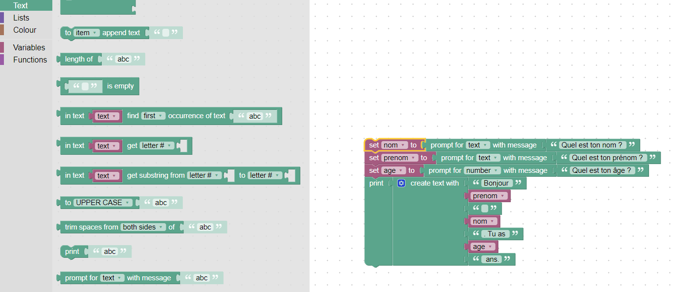 executer le code qu'il y a dans le "do" sinon celui dans "else". Le "else" n'est pas affiché par défaut, il faut l'ajouter en cliquant sur la petite roue dentée a gauche du if. Dans l'exemple ci-dessous, il va demander au programme d'afficher "Vous êtes majeur" si l'âge est plus grand ou égal à 18 ou "Vous êtes mineur" dans le cas contraire. Exemple |